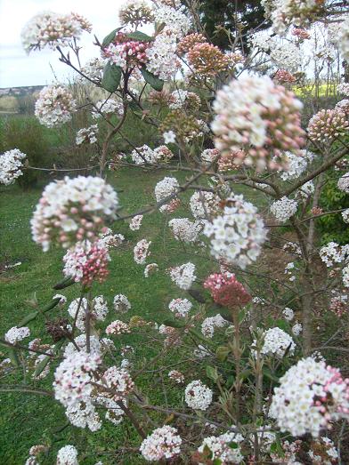 Cette viorne est chez moi quasiment caduque (seules persistent quelques feuilles à son pied) et son feuillage apparaîtra dans le courant du moi d'avril. Elle ne demande pour l'instant aucune soin. Arrosage, engrais et taille sont inutiles.Ses fleurs harmonieusement réparties sur les branches du sommet à la base tiennent longtemps et résistent aussi bien à la chaleur qu'à la pluie. Cette merveille d'arbuste décore somptueusement la partie sud du jardin où en mai d'autres viorne originaires de Chine seront les vedettes.